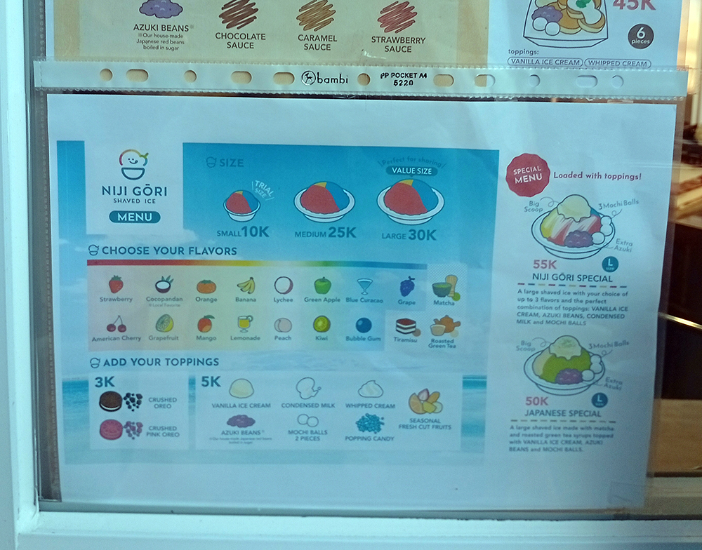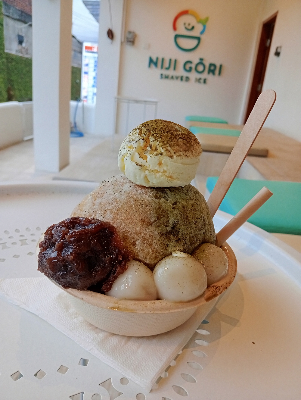 汗をかいたので、サヌールのメイン通りにある「NIJIGORI」というカキ氷やさんに立ち寄り休憩。サイズが3タイプ、フレーバーもたくさんあって迷ったので、「ジャパニーズスペシャル」という盛り合わせのものにしてみました。