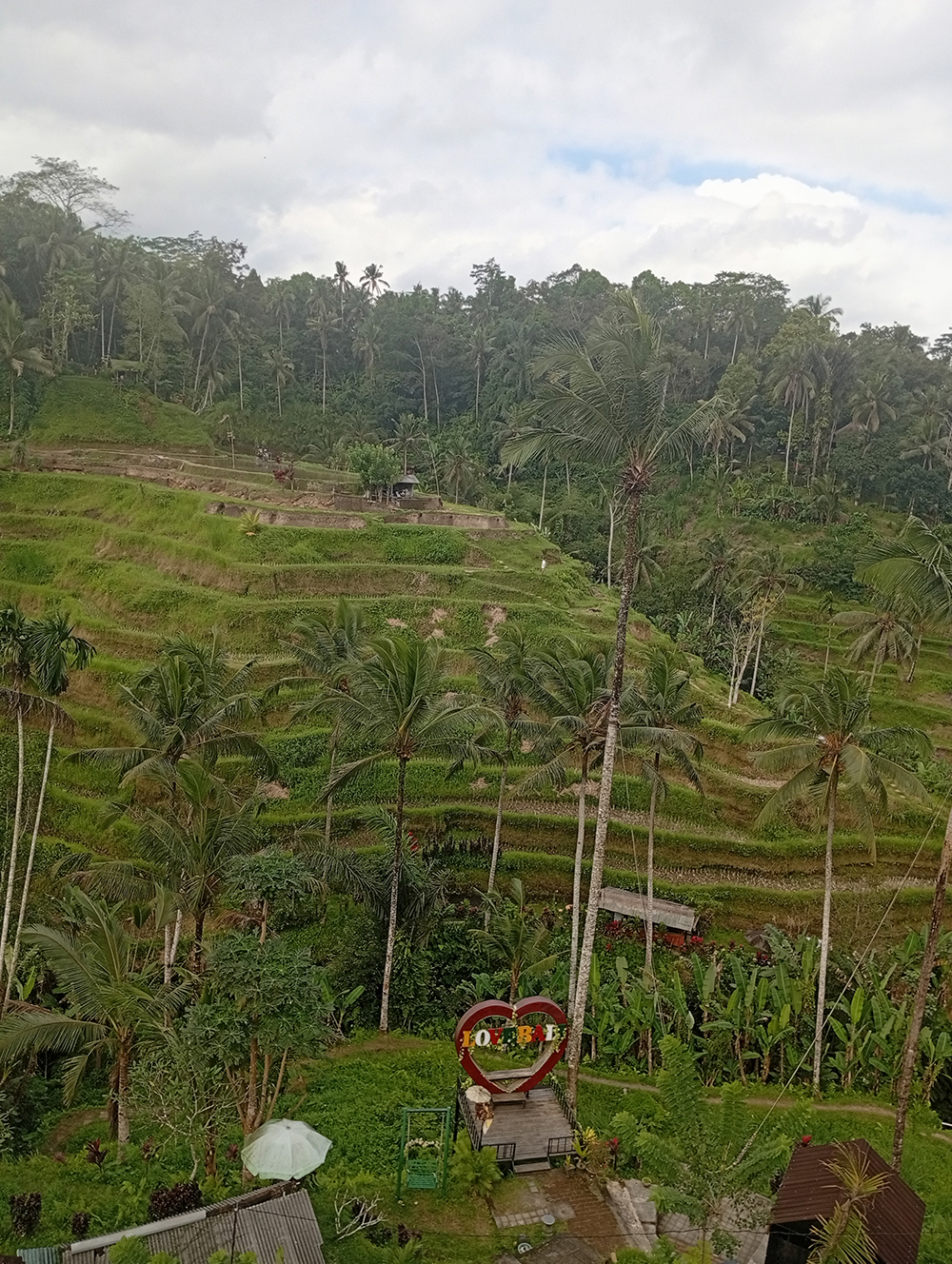 今日のテガラランは田植えしたてで緑が少なかったです。が、棚田の淵側は雑草?草が生えているんで一応、緑もある段々畑が見えました。久しぶりに来たら、SNS撮影スポットにぴったりなブランコがありました。(最近のバリ、ブランコをおいて撮影スポットにするところ増えている気がします)カラフルにLOVE BALIと書いてあります。 ただし、無料で自由にというのではなく、5万ルピア位とられるみたい。何でも商売にするなあ~。
